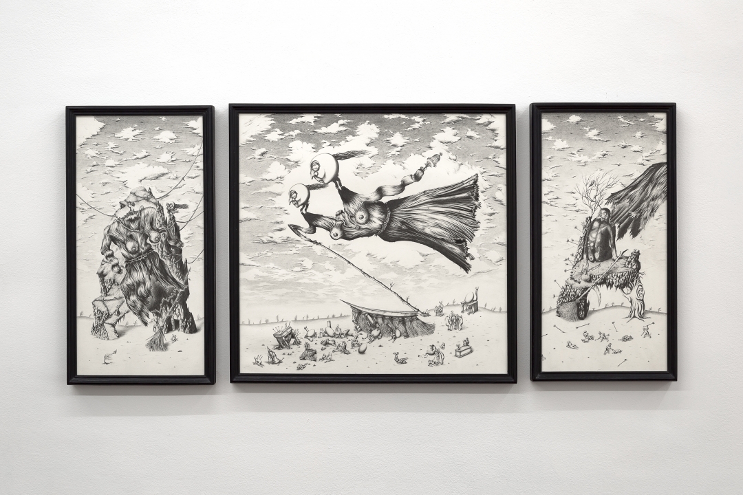Nicolás Said. Tres vestidos (tríptico). Grafito y carbón sobre papel, 53 cm x 108 cm, 2021